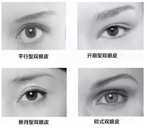 双眼皮有新月形、扇形、平行型这三种形状。新月形双眼皮的特点是眼角窄、中间宽,显得眼睛比较圆大;扇形双眼皮则是右眼角向外逐渐变宽,显得人清秀妩媚;而平行型双眼皮则与眼睑平行距离大致一致,显得人比较洋气,这就是最近流行的“混血范儿”双眼皮。欧式双眼皮宽而清晰,睫毛长而上翘,眼窝深陷,眼球四周上下有一圈明显的眼眶沟,使眼清更富有立体感,再加上深而蓝的眼球,的确使欧美人的眼有一种特殊的美丽。